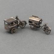 Twee 2e gehalte zilveren miniaturen: ijscokar en broodkar, gewicht 53 gram, 3 x 5,5 x 2,5 cm