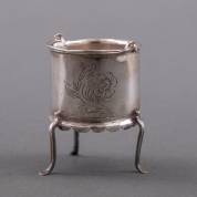 Zilveren miniatuur: ketel met gegraveerde bloemen, hengsel, en staande op drie poten, 18e eeuw, gekeurd met belastingteken voor oude kleine werken 1831-1893 -deukje-, gewicht 16 gram