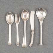 Zilveren miniaturen: zilveren couvert, Haags lof, mes met pistoolheft, twee extra lepels, deels 18e eeuw, gewicht 9 gram, 5,25 cm