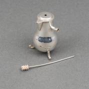 Zilveren miniatuur: chocoladekan met roerstok, staande op drie pootjes, meester: Jacobus van Geffen, Amsterdam, 1755, gewicht 42 gram -houten steeltje ontbreekt-, 5,5 cm