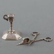 2e gehalte zilveren miniaturen: kaarsensnuiter en niet bijpassende houder, meester: wed. Willem de Pleijt, Schoonhoven, circa 1880, gewicht 24 gram, 3 cm
