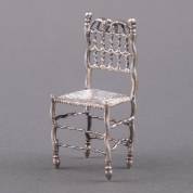 Zilveren miniatuur: stoel, 18e eeuw -één regel ontbreekt-, vergelijkbaar staat afgebeeld in Tall and Small, antique Dutch silver miniatures, door A. Aardewerk op blz. 32, gewicht 23 gram