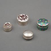 Vier ronde zilveren pillendoosjes, waarvan twee geëmailleerd en één ingelegd met parelmoer, diverse gehaltes, brutogewicht 55 gram, 2 x Ø 3 cm
