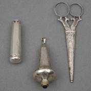 Schaar met 2e gehalte zilveren grepen in schede, gladde 1e gehalte zilveren naaldenkoker, en peervormige 2e gehalte zilveren bediendebel, Duitsland, circa 1900, vermaakt tot hanger -gebruikssporen-, brutogewicht 43 gram, 12 x 4 cm