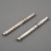 Twee zilveren naaldenkokers, één geribd met gemonogrammeerd schildje, de ander met bandgravering en niet gegraveerd schildje, gewicht 25 gram -één gedeukt-, 10,5 x Ø 1 cm