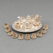 Twaalfpersoons miniatuur koffie- en theeservies, meester: J.H. Roelfsma, Winsum, circa 1900, bestaande uit: koffie- en theepot, roomkan, suikerpot, dienblad en twaalf kop-en-schoteltjes, alle met rijk bladdecor, gewicht 258 gram, herkomst: nalatenschap oud-antiquair Zeist, 1 x 15 x 11.5 cm