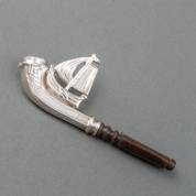 Zilveren pijpje met decor van een zeilschip met houten mondstuk, 19e eeuw, brutogewicht 9 gram -keuren gesleten-, 3,5 x 9,5 cm
