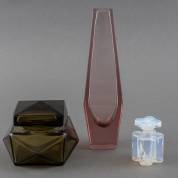 Glazen parfumflesje, glazen stopfles -kleine chips-, en glazen vaas, 23,5 x 6,5 x 6,5 cm