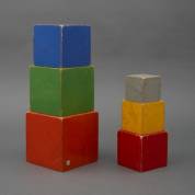 Serie multiplex blokken in oplopend formaat, in diverse kleuren gelakt, uitvoering Ado -defecten-, 15 x 15 x 15 cm