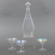 Karafje met drie likeurcoupes, model Romanda blank irisé, ontwerp Andries Dirk Copier, uitvoering Glasfabriek Leerdam -randchips van stopje-, 23 x Ø 8 cm