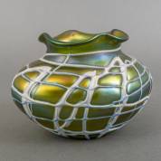 Iriserende groene glazen vaas met zilverwit lijnendecor, vermoedelijk uitvoering Pallme-König, 16 x 23 x 16 cm