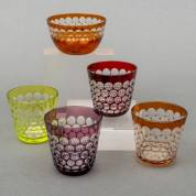 Drie geslepen glazen: groen, robijnrood en violet, model Kugelbecher, ontwerp en uitvoering Carl Rotter, Lübeck, daarbij: vergelijkbaar geslepen amberkleurig glas en schaaltje, 8 Ø8 cm