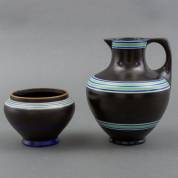 Schenkkan met lijnendecor, uitvoering Plateelbakkerij Schoonhoven, daarbij: kleine cache-pot met lijnendecor 'Effect', uitvoering Koninklijke Plateelbakkerij Zuid-Holland, Gouda, 19 x Ø 15 cm
