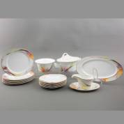 Aardewerk serviesgedeelte, decor 'Mythos', ontwerp Paul Wunderlich, uitvoering Rosenthal, bestaande uit: één opdienschaal, grote soepterrine, juskom op los onderbord, zes dinerborden, zes diepe borden, eind 20e eeuw, 20 x 35 x 18 cm