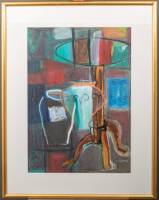 Ian Humphreys (1956), kleurrijke compositie van twee vazen met een bijzettafeltje, gemengde techniek op papier, r.o. gesigneerd, 71 x 50 cm