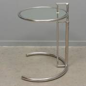 Rond verchroomd stalen bijzettafeltje met glazen blad, het blad in hoogte verstelbaar, in de stijl van Eileen Gray, 70 x Ø 50 cm