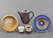 Divers deels geglazuurd aardewerk: theepotje met twee theezeefjes, bruin geglazuurd schaaltje, beide uitvoering Zaalberg, en bruin-blauw geglazuurd schaaltje, midden 20e eeuw, 16 x 20 x 10 cm