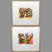 Anton Rooskens (1906-1976), twee zeefdrukken: kleurrijke composities in roze, oranje, en geel met zwarte fantasiewezens, r.o. in potlood gesigneerd en gedateerd '62 en '67, 29 x 37 cm
