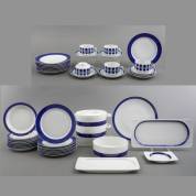 Wit porseleinen serviesgedeelte met blauwe bies, uitvoering Thomas, Duitsland, bestaande uit: twee dekschalen, één serveerschaal, drie rechthoekige serveerschalen, één taartschaal, acht grote borden, acht kleine borden, en acht diepe borden, daarbij: vijf kop-en-schotels met grafisch decor, uitvoering Mosa, 7,5 x Ø 20,5 cm