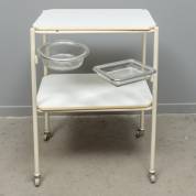 Wit metalen dokterstafel met twee formica bladen en twee verstelbare glazen schalen in chromen houder, jaren '60, 80 x 60 x 42 cm