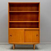 Teakhouten boekenkast met bovenin twee plankenleggers, en onderin twee deurtjes, het geheel staand op taps toelopende pootjes, vermoedelijk Scandinavië, midden 20e eeuw -kringen in interieur-, 153 x 99 x 33 cm