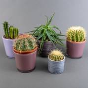 Twee aardewerk cache-pots met cacti, uitvoering Mobach, Utrecht, daarbij: drie glazen cache-pots met cacti, -vetplant midden op foto heeft het leven opgegeven, zit niet meer in de pot-