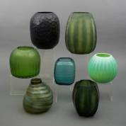 Zeven diverse groene glazen vazen, waarvan zes uitvoering Guaxs, Duitsland, 26 x Ø 18 cm