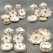 Aardewerk serviesgedeelte, decor Old Leeds Floral, uitvoering Royal Doulton, bestaande uit: 5 dekselschalen, een grote kom op onderschotel, 7 opdekschalen van diverse formaten, 2 saucières, 10 soepborden, 22 dinerborden, en 8 ontbijtborden