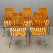 Vijf 'Scandia Chairs', ontwerp Hans Brattrud, uitvoering Hove Möbler, Noorwegen, jaren '60/'70 -gebruikssporen, drie stoelen met schade aan hoek van meest linkse lat, waarvan één met enkele afwijkende schroeven-, 97 x 52 x 50 cm