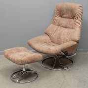 Bruin lederen fauteuil met chromen onderstel, met ottoman, uitvoering Stessless Ekornes, 105 x 80 x 85 cm