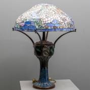 Grote drielichts Tiffany-stijl tafellamp, de kap met decor van Chinese draken, de stam rondom met iriserend glas, 82 x Ø55 cm