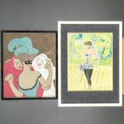 Europese School, twee werken: burlesque danseres op toneel, gemengde techniek op papier, r.o. gesigneerd Janson, en gemaskerde dame met twee figuren, r.o. in potlood gesigneerd J.P. Matts/Mertts en gedateerd '09, 30,5 x 23,5 , 33,5 x 27,5 cm