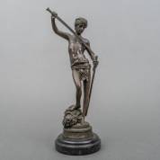 Bronzen beeldje: jongeman met zwaard, gesigneerd A. Mercie, met gietersmerk: 'Bronze garanti Paris J.B., Deposee', 34 Ø11 cm