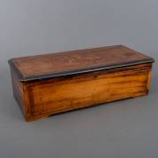 Palissandergefineerde speeldoos met acht melodieën en bloemmarqueterie in het deksel, tweede helft 19e eeuw -speelt, één tand van de kam ontbreekt, gebruikssporen aan kast-, 16 x 53 x 24 cm