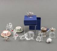 Zeven geslepen kristallen beeldjes, waaronder Jan Klaassen, alle uitvoering Swarovski, 20e/21e eeuw, daarbij: geslepen inktpotje, biscuit gebakken porseleinen kinderkopje, uitvoering Meissen, en twee miniatuur kop-en-schotels, 4 x 9 x 4 cm