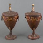 Paar beschilderde tinnen kastanjevazen met Aziatisch decor, 19e eeuw -gedeukt, scheur in deksel, schildering sleets-, 32 x Ø 15 cm