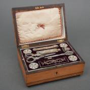 Mahonie ingelegd naaidoosje met garnituur, bestaande uit: parelmoer wolwinders, zilveren vingerhoed, naaldenkoker, etc. -spiegeltje missend, deels samengesteld, kleine defecten-, 8,5 x 19 x 13 cm