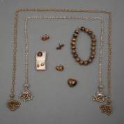 Manchetknopen en kralenketting van versteend hout, twee metalen kettingen, etc.