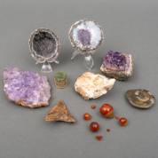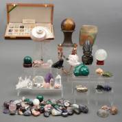 Diverse stenen, mineralen en fossielen, daarbij: metalen pillendoosje met groen stenen deksel