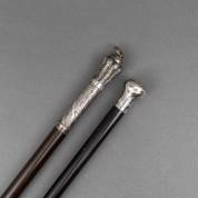 Twee houten wandelstokken met zilveren greep, 93 cm