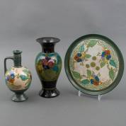 Plateel kruikje, bord en vaas met polychroom decor, uitvoering Koninklijke Plateelbakkerij Zuid-Holland, Gouda, voor Zeepfabriek De Duif, Den Dolder -randchipje in kruik, haarlijn in vaas-, Ø 29 cm
