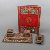 Met leder bekleed houten inktstel, het geheel met blindgestempeld decor: griffioenen rondom wapenschild: kerktoren met leeuw, waaromheen voluten -één deksel los-, daarbij: rood lederen documentenmap met blindgestempeld polychroom beschilderd decor van griffioenen en voluten