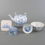 Duits porseleinen theepot, Delfts aardewerk tegel, Japans porseleinen theebusje, Chinees porseleinen kom en een Chinees porseleinen schoteltje, 17 x 25 x 16 cm