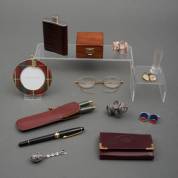 Heupflacon, manchetknopen, pennen, beeldjes, Cartier sleuteletuitje, etc., 10,5 x 6 x 2 cm