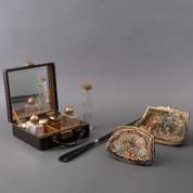 Zwart lederen koffertje met reisnecessaires, zwartgelakte schoenlepel met metalen knop, en twee avondtassen met vergulde beugels, beide 20e eeuw, 19,5 x 20 x 7 cm