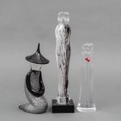 Knielende glazen figuur, uitvoering Formia, Murano, voorzien van originele sticker en gemerkt, modern, daarbij: twee glazen beeldjes: liefdesparen, 36 cm