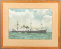 Foto in kleur van het schip 'Willemstad' van de Koninklijke Nederlandse Stoomboot-Maatschappij, voer op Curacao, Suriname en Zuid-Amerika, 44 x 63 cm