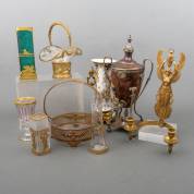 Divers kleingoed, waaronder: koperen kraantjeskan met verzilverde details, gedecoreerd met ramskoppen en vaasvormige ornamenten, empirestijl -één pootje defect-, aardewerk vaas met polychroom bloemdecor en verguld bronzen grepen en basement, turquoise glazen vaas en glazen mandje, beide met verguld metalen monturen -mandje klein defect aan guirlande-