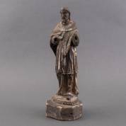 Gestoken naaldhouten beeld van een heilige, mogelijk Franciscus, met resten van polychromie -handen ontbreken-, 35,5 x 11 x 10,5 cm
