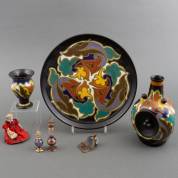 Plateel vaasje, karaf en bekertje, twee glazen parfumflesjes, popje met een popje en beeldje van jongen met aapje op kleed -gebruikssporen-, Ø 30 cm